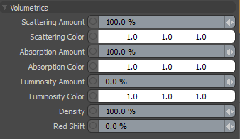 다음 설정은 볼륨 항목에만 적용되며 표면에는 영향을 미치지 않습니다. 마찬가지로 다른 곡면 속성과 같은 Diffuse Color 과 Reflection Amount 부피 측정 항목에는 영향을 미치지 않습니다. 볼륨 항목에는 아래 값을 곱하는 역할을하는 유사한 옵션도 포함되어 있으므로 추가 조정 옵션을 사용할 수 있습니다.