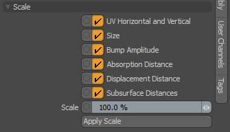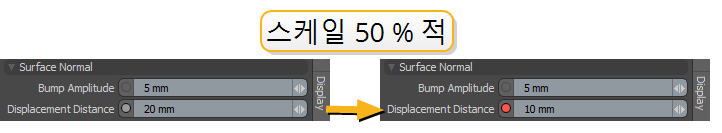 스케일 값을 재료의 선택된 속성으로 구우려면 Apply Scale. 이것은 재료의 값을 수정합니다. 예를 들어 스케일링 Displacement Distance 재료의 절반을 50 % Displacement Distance 값.