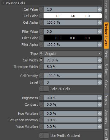 그만큼 Poisson Cells 텍스처는 절차 적으로 생성 된 텍스처입니다. 절차 텍스처는 렌더링시 수학적으로 만들어 지므로 고정 해상도가 없습니다. 그것들은 상세하게 손실없이 거의 무한대로 확대 될 수 있습니다. 그만큼 Poisson Cells 텍스처는 두 영역으로 해결할 수 있습니다. Cell 과 Filler 가치. 텍스처는 설정에 따라 한 영역에서 다른 영역으로 변조됩니다. 각 영역은 Value 설정 또는 Color 과 Alpha. 적용된 영역은 레이어 효과 텍스처가 적용되는예를 들어 텍스처를 Displacement그런 다음 Modo 사용 Value 텍스처 효과를 Diffuse Color , Modo 사용 Color 과 Alpha 에 대한 설정 Cell 과 Filler 가치.