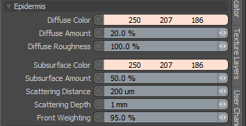 흡수, 산란 및 반사되는 빛의 색상을 결정합니다. 표피는 상당히 반투명하며 밑 표면 색상은 기본적으로 Diffuse Color 인간의 피부를 위해.