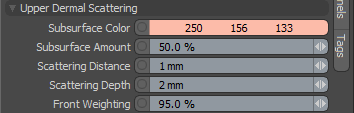 그만큼 Skin Material 표준의 기본 BRDF 음영 계산을 완전히 대체하도록 설계되었습니다. 재료 표면에 적용될 때 품목. 인간의 피부는 여러 층과 물질로 구성된 다소 복잡한 기관으로, 각각 빛을 다르게 흡수, 산란 및 반사하여 인간으로서 친밀하게 친숙하지만 매우 미묘하지만 뚜렷한 외관을 만듭니다. 이러한 복잡한 표면을 시뮬레이트하기 위해 특별한 Material 쉐이더가 필요했습니다. 이 소재는 피부에 대한 미묘한 뉘앙스를 모방하기 위해 가장 친숙한 옵션으로 구성되어 있습니다.