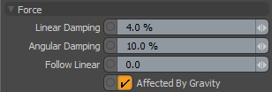 이것은 물체의 움직임에 작용하여 시간이 지남에 따라 속도를 늦추는 힘입니다. 여기에 작은 값이 있으면 개체가 안정 될 수 있으므로 개체 안정성에 도움이됩니다. |