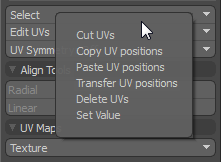 그만큼 Copy UVs 명령은 선택한 형상의 UV 값을 내부 버퍼에 복제합니다. 값이 저장되면 다음을 사용하여 향후 선택에 적용 할 수 있습니다 Paste UV positions 명령.