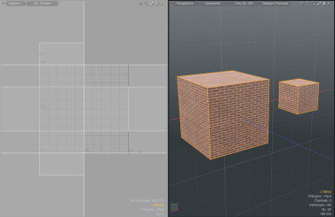 두 메시의 UV는 서로 다른 텍스처 크기를 업데이트하고 표시합니다. 모든 축에서 50 % 배율이 조정되는 작은 큐브는 텍셀 밀도 값이 다르게 조정 된 더 큰 큐브와 일치합니다. 두 메시의 월드 공간이 고려됩니다. 사용 된 브릭 이미지의 크기는 두 메시 모두 동일합니다.