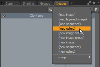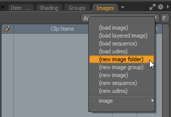 UDIM 이미지 세트를 보유하려면 새 폴더를 만들어야합니다. 를 클릭하십시오 Images (또는 Clips) 탭. 이 탭은 일반적으로 Shader Tree 뷰포트. 클릭 Add Clip 버튼을 누르고 (new image folder) 선택권.