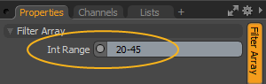 필터를 지정하려면 Filter Array 노드와 Properties 오른쪽에 Int Range 들.