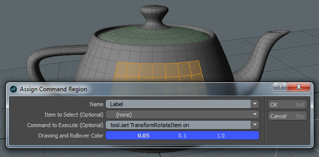 명령 영역을 사용하면 명령 또는 스크립트를 실행하고 메시 영역을 클릭하여 장면에서 다른 항목을 선택할 수 있습니다. 명령 영역은 메쉬 항목에서 선택한 다각형으로 정의되며 3D 뷰에서 다각형을 식별하는 데 도움이되도록 색상을 할당 할 수 있습니다.