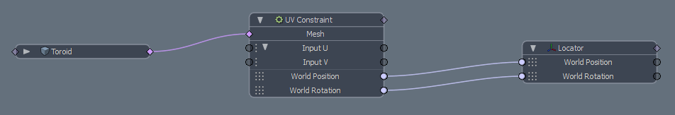 UV 구속 조건은 다각형에 대한 3D 회전 위치 매트릭스를 특정 UV 좌표에 제공하는 구속 조건 유형입니다. 수정 자에서 두 개의 행렬이 출력됩니다. World Position 과 World Rotation. World Position UV 좌표의 3D 위치를 나타내고 World Rotation 는 법선, dPdu 및 dPdv로 구성된 3D 표면의 회전을 나타냅니다.