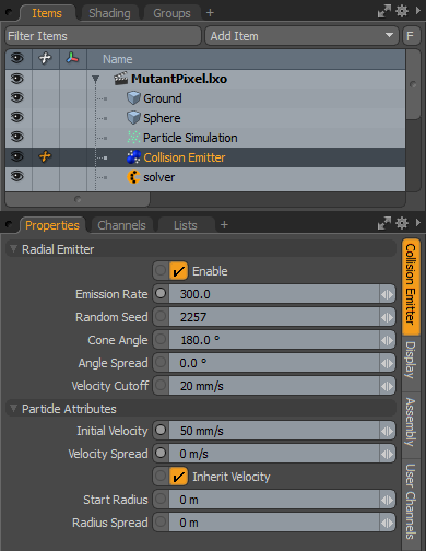 두 개 이상의 동적 요소가 정의되어 있고 Items 목록에서 Emit on Collision 단추. 이것은에 추가 Collision Emitter 항목에서 자동으로 올바르게 연결 Schematic 전망). 시뮬레이션을 평가하거나 캐싱 할 때 파티클은 Emit on Collision 항목이 추가되었습니다. 팩트 이미 터에 팩트 후에 추가 아이템을 추가하기 위해, 콜리 전 이미 터와 관련된 그룹 아이템에 동적 아이템을 추가 할 수 있습니다. ㅏ Dynamic Collider 결과 입자가 충돌하고 동적 요소와 상호 작용하도록 항목을 추가 할 수 있습니다. 방출 된 입자는 충돌 이미 터의 설정에 의해 제어됩니다. 선택하면 다음 특성이 표시됩니다. Properties 패널.