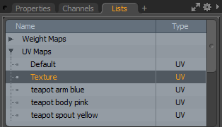 • 오른쪽 패널 하단에서 Lists 탭, 확장 UV Maps목록에서 선택하십시오. 그것은 ~라고 불린다 Texture 기본적으로.