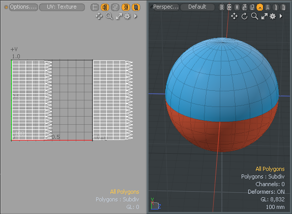 메쉬가없는 경우 예시 장면 사용 sphere-two_materials-one_uv_island.lxo.