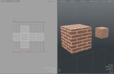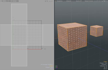 두 메시의 UV는 서로 다른 텍스처 크기를 업데이트하고 표시합니다. 모든 축에서 50 % 배율이 조정되는 작은 큐브는 텍셀 밀도 값이 다르게 조정 된 더 큰 큐브와 일치합니다. 두 메시의 월드 공간이 고려됩니다. 사용 된 브릭 이미지의 크기는 두 메시 모두 동일합니다.