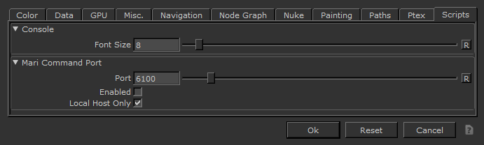| 2. | Select the Scripts tab and ensure that the Mari Command Port is Enabled. The default Port number should only be changed if it is already in use by another application. This number should match the port number set in Nuke under Project Settings > Mari. |