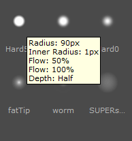 Tip: When you hover the mouse over a brush, tooltips display key properties: