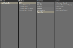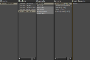 In Mari 4.0, the Paint Target quick palette (hold the I key) allows you to select your objects, shaders, channels, layers, and paint targets (paintable layers or masks). |