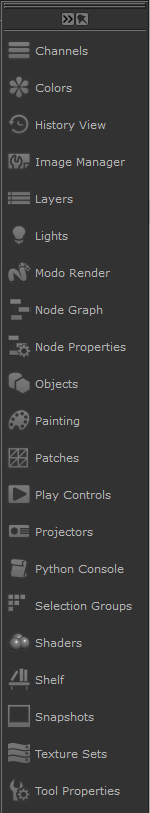Displaying the Palettes ToolbarBy default, the Palettes toolbar displays on the right of the application, but you can also place the Palettes toolbar on the left, or at the top or bottom like any other Mari toolbar. You can choose to display the Palettes toolbar with its icons only (see image on the left) or the extended Palettes toolbar with its icons and palette names (see image on the far left) by toggling the Show/Hide Opening/Maximizing PalettesPalettes open in one of two modes from the Palettes toolbar; Pinned or Floating. The palettes have three open states; docked, floating, and temporarily floating states. From the Palettes toolbar, choose in which mode to open palettes and then click on them: • Use the Pin Palette The palettes open where they were last closed in docked or floating state. Note: In Pin Palette • Use the Float Palette If a palette is already docked in the application, it maximizes or minimizes it. If a palette is stacked under another palette, it displays it on top of the stack. While in Float Palette Note: Switching between Pin Palette When a palette is closed, its background in the Palettes toolbar is dark gray, and when it is open it is darker gray. Closing/Minimizing PalettesThe behavior for closing palettes varies depending on the palette opening modes and palette open states: • Pin Palette • Float Palette Note: To know more about organizing your palettes, see Choosing and Organizing Palettes. For details on the Palettes toolbar's controls, see Toolbars. |