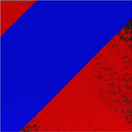 The following table illustrates a basic layer stack with two layers in a diffuse channel. One layer shows a red stripe, the other shows a blue stripe. The order of the two layers determines which texture appears on top. The table shows the results of swapping the order of the layers.