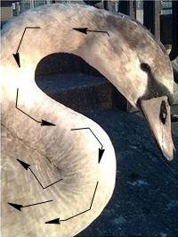 For example, in the image on the left, the feathers on the swan are determined to be following the curve of the neck. This impacts the feather pattern, so that the vectors in the texture curves around to display the natural flow pattern. In the image on the right, the vectors have been painted on the image to show how this flow pattern might appear.