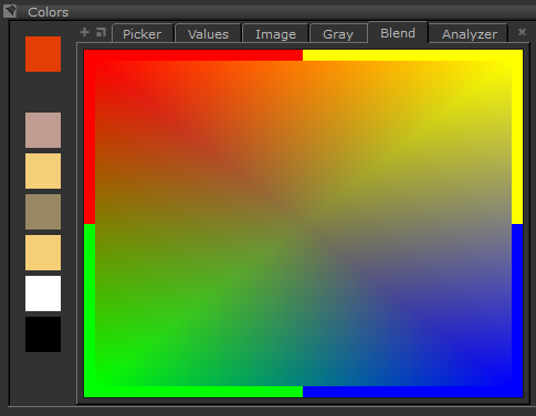 • Blend - to pick from a field blending four colors. Click any of the color swatches (foreground color or recently used colors) and drag-and-drop them to any corners of the color field. Then click in the color field to pick from the blend.