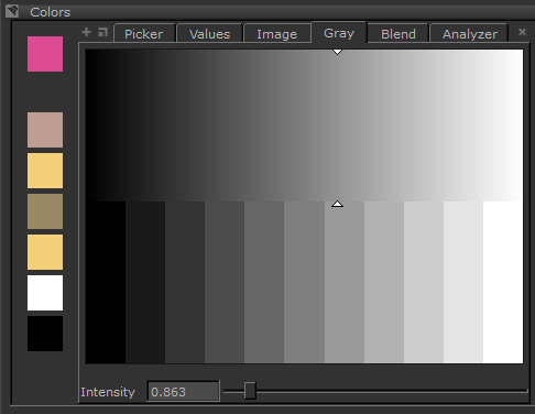 Tip: By default, Mari opens the following tabs: Picker, Values, Image, Gray, Blend, and Analyzer. You can add additional color tabs: Color History, Colorspace, and Sliders.