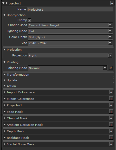 Tip: Don't change the settings for Transformation or Perspective. These show the details of the paint buffer and perspective camera settings when the projector was created (including, for perspective cameras, field of vision and clipping planes).