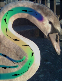 For example, in the image on the left, the feathers on the swan are determined to be following the curve of the neck. This impacts the feather pattern, so that the vectors in the texture curves around to display the natural flow pattern. In the image on the right, the vectors have been painted on the image to show how this flow pattern might appear.