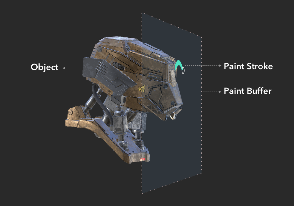 Unlike most 3D painting applications, Mari uses a projection based painting system, which is achieved by using a paint buffer. You can imagine Mari's paint buffer as a pane of glass located between the artist's view and the canvas.
