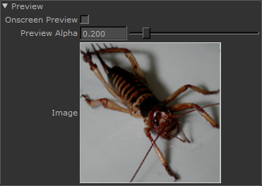 | 6. | To turn the onscreen preview on when cloning from an external image, under Texture > Preview, click to turn Onscreen Preview on. Set the Preview Alpha to your preferred value (higher makes the preview clearer, but makes it harder to see the current paint in the channel). |