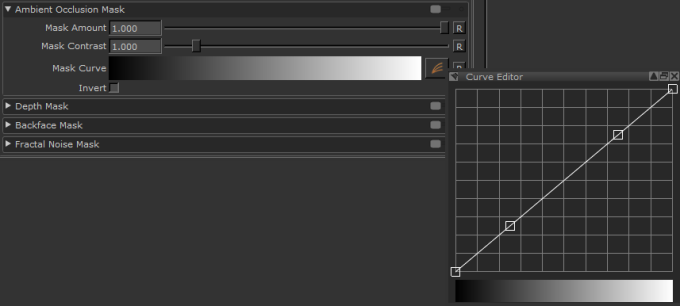 • Mask Curve - controls how the ambient occlusion pixel values relate to the degree of masking. The horizontal axis is the darkness of the occluded pixels (black to the left, white to the right), the vertical axis is the degree of visibility. By default, this is a direct line, where white pixels are totally masked, black pixels are totally unmasked, and 50% gray is 50% masked.