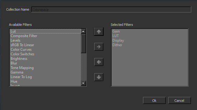 The Edit dialog box displays the filters available for building up a color profile. For the Colorspace Color Profile, three filters - Gain, LUT, Display, and Dither - are selected by default and cannot be deleted.