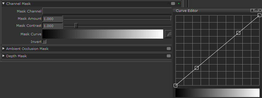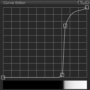 • Mask Curve - controls how the input pixel values relate to the degree of masking. The horizontal axis is the darkness of the input pixel (black to the left, white to the right), the vertical axis is the degree of visibility. By default, this is a direct line, where white pixels are totally masked, black pixels are totally unmasked, and 50% gray is 50% masked.