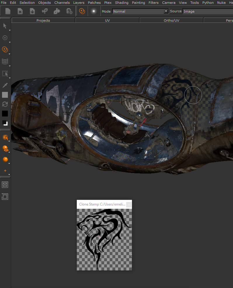Like with other paint programs, Mari lets you superimpose image files onto the surface of an object. To manage image files, Mari includes the Image Manager palette. To paint with images you've loaded into the Image Manager palette, Mari has two main tools: Paint through and Clonestamp: