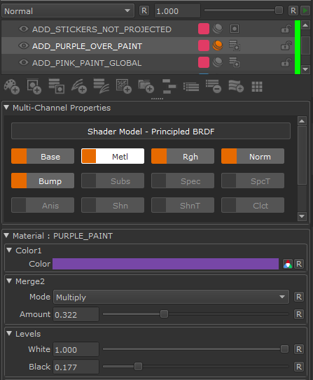 - Select a material or multi-channel group layer in the Layers palette.