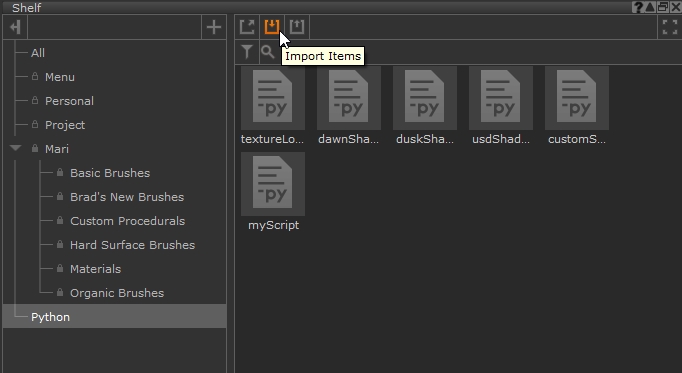 Sharing Python scripts created through Mari's powerful Python API encourages collaboration between artists and storing these scripts in shelves means you can execute a script by double-clicking it in the shelf. For example, a colleague may have created a Python script that automatically imports certain textures for a show you're working on. By importing this script to a Shelf Item, you no longer need to install this script manually. Instead, simply run the script each time you start on a new asset for the show - keeping the look of the show consistent and reducing project setup time.