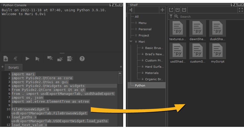 Python scripts are added to shelves by importing .py files from disk or by dragging code from the Python Console in Mari.