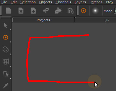 When you release the mouse button, the tracing disappears and Mari performs the function you selected (in the illustration, the Clear Painting function).