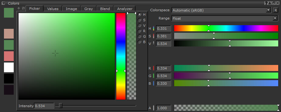 Tip: The swatch on the shelf only holds the color values, not the alpha. Swatches on shelves always have an alpha of 1.0. You can also drag and drop color swatches from anywhere else they appear in Mari (such as the Properties palette or Select Color dialog box).