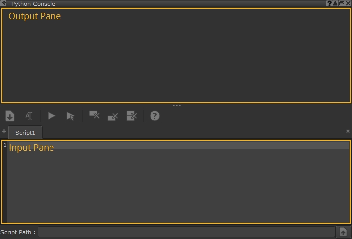 The Python Console is divided into three parts, the output pane, the toolbar, and the input pane. Use the input pane to enter and evaluate Python statements and the output appears in the output pane.