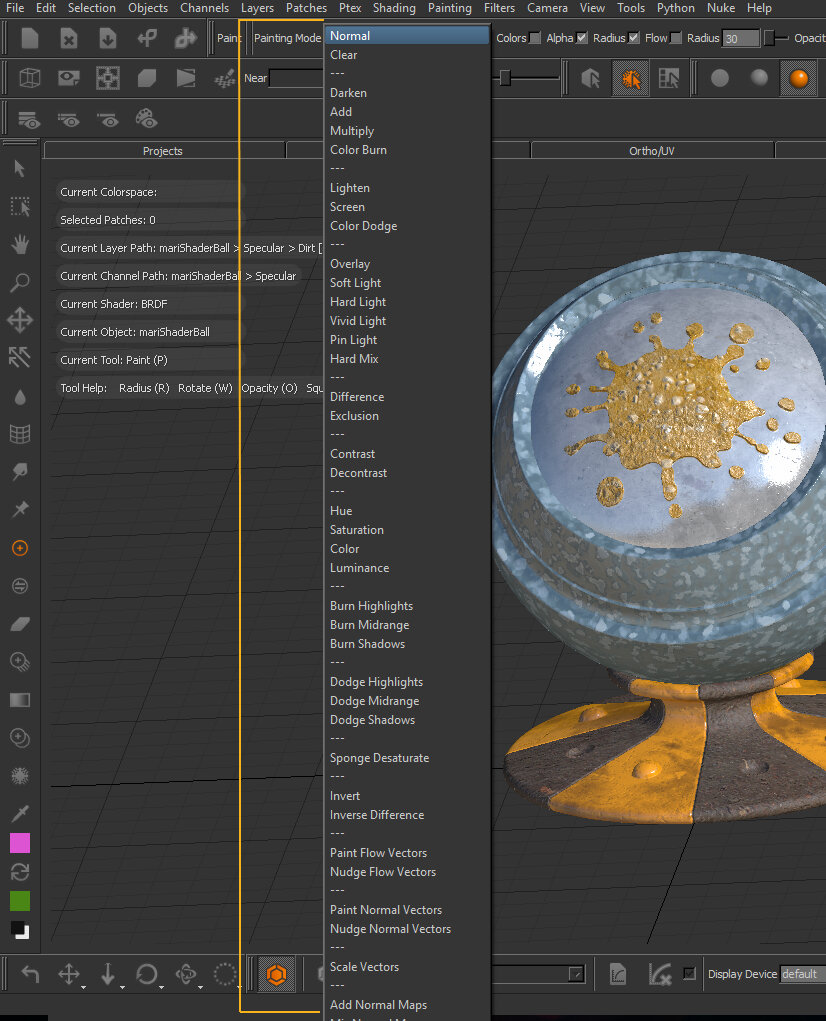 In Mari 4.0, Blending modes have been categorized making them easier to navigate to in the dropdown menu. |