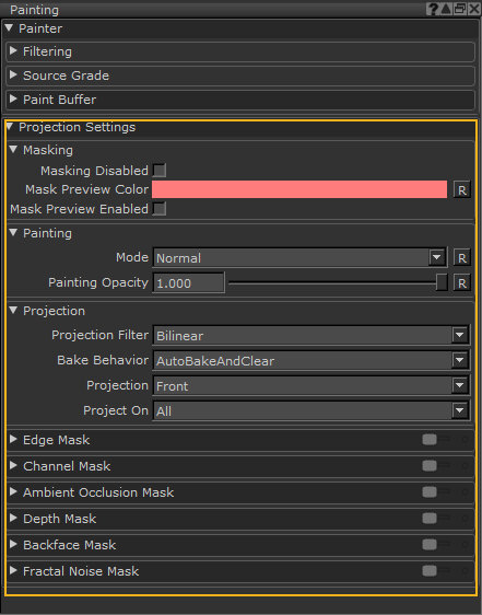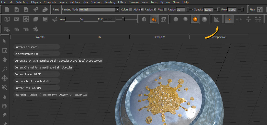 In Mari 4.0, the projection settings are now in the Painting palette under the Projection Settings group. |