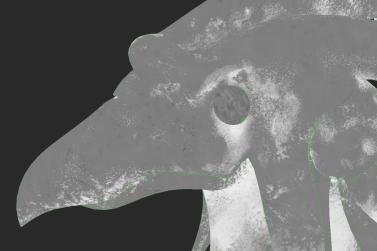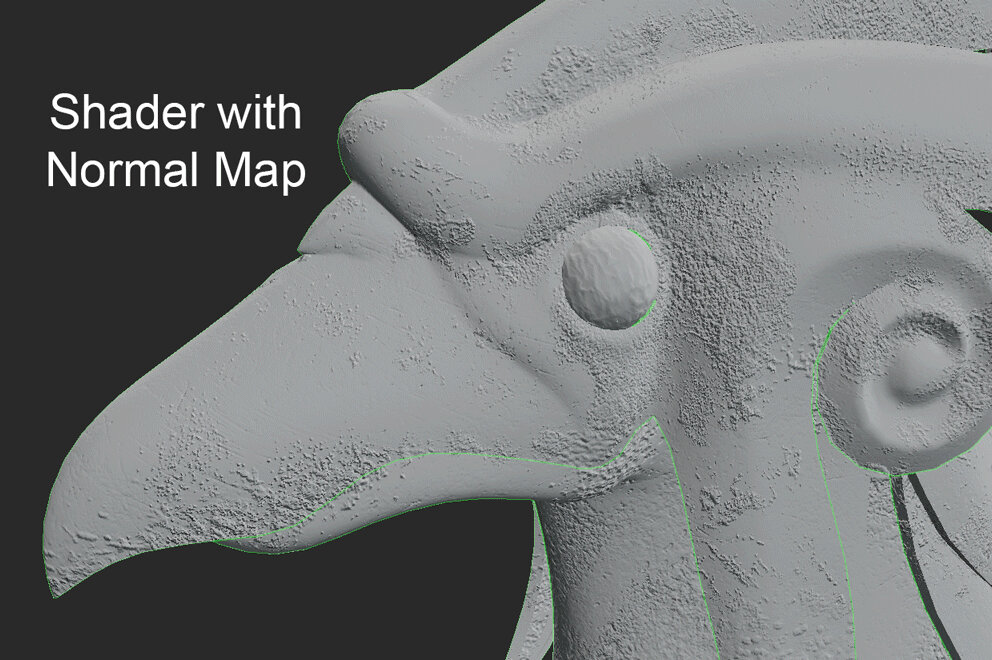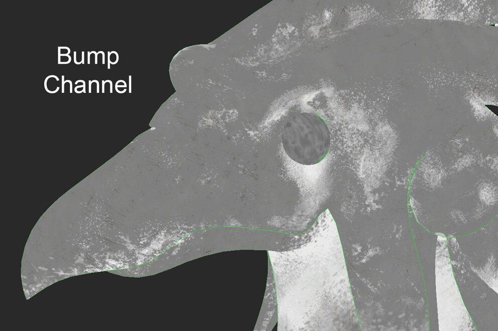 In the example, the Bump channel that was set up informs the mesh where the areas around the beak and eyes should raise. Converting the Bump map to normal data creates a 'facing' as well as height, which produces more realistic specularity breakup when the light hits the geometry.