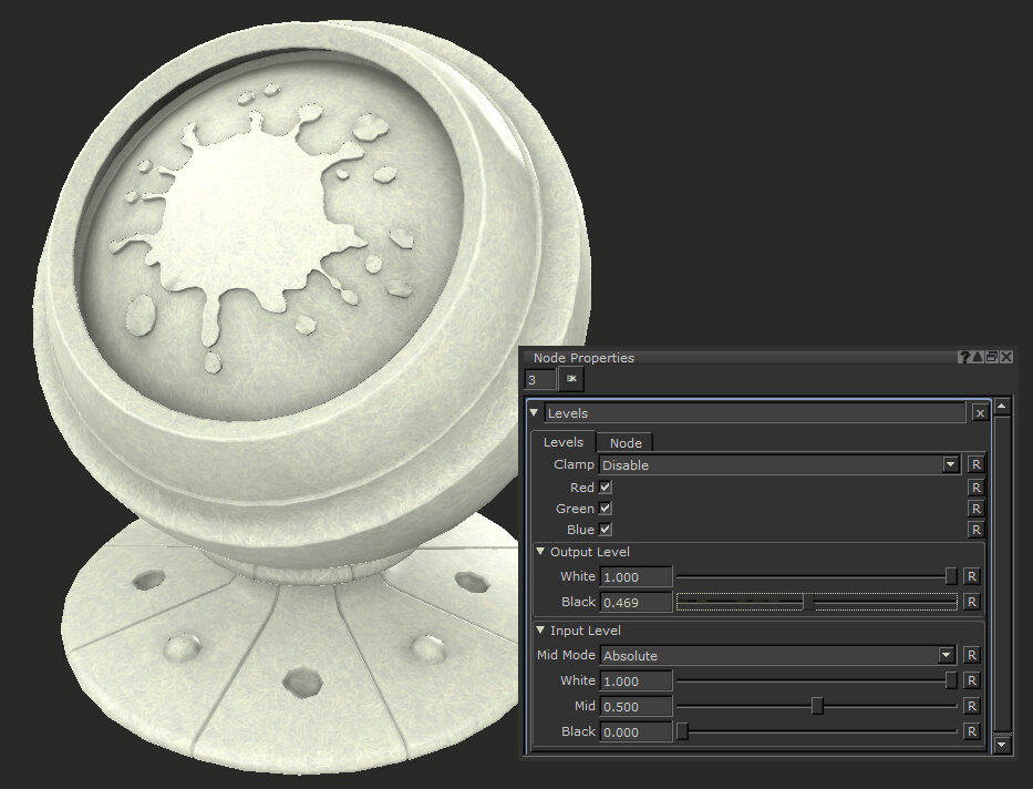 If you have imported image resources that need to match images from a different source (such as an on-set photography reference) a Levels node is a great way to get two images or projections to work together. The Levels node is also a good node to use in conjunction with an HSV node to adjust the Saturation Scale and Hue Shift for final color tweaks.