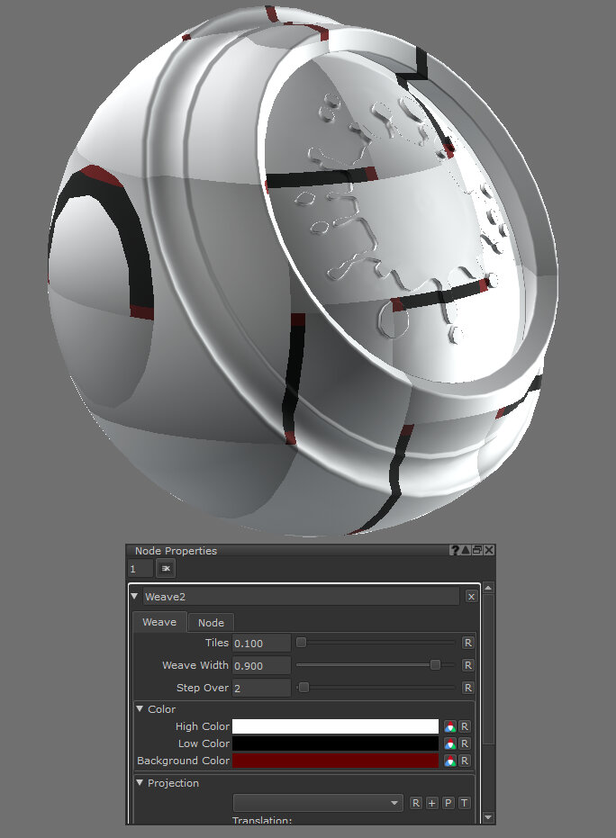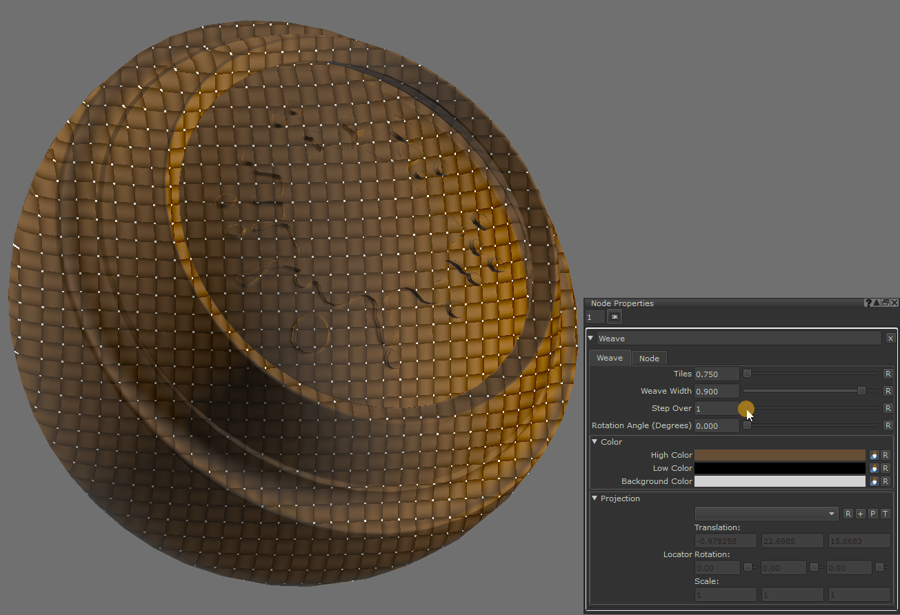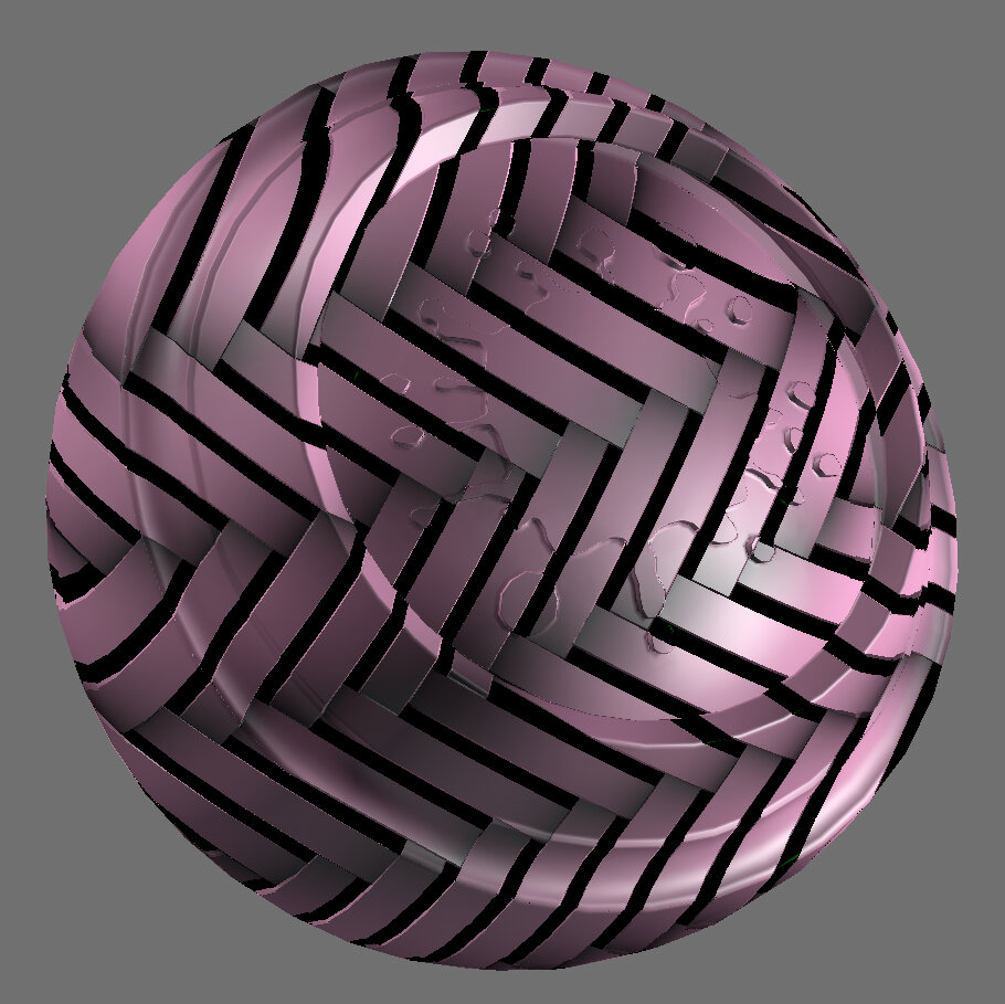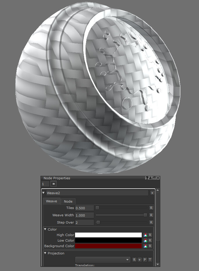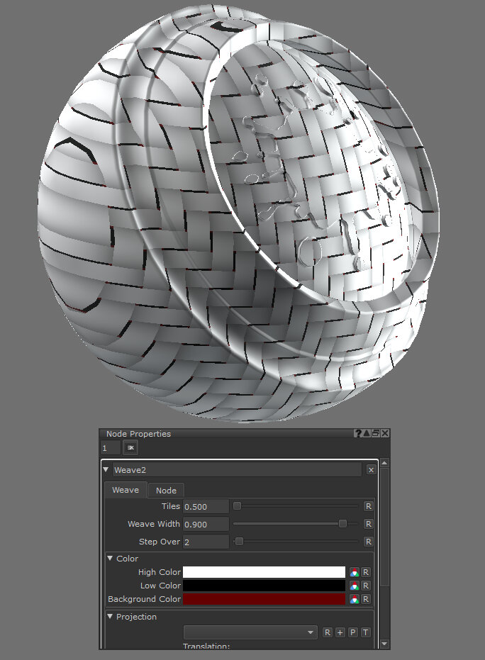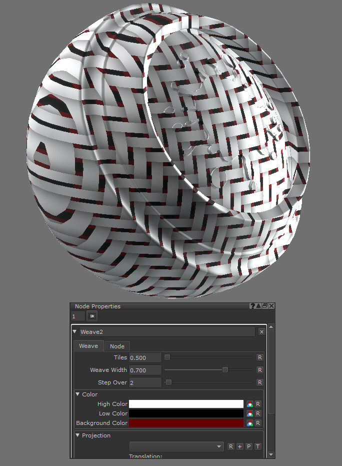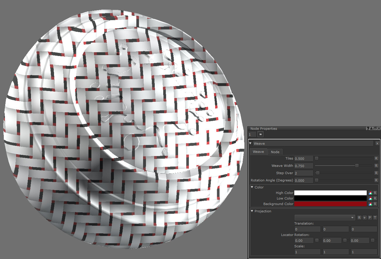 This node generates a pattern of interwoven strips. This can then be used as a height map, mask or as both to texture objects with a woven material.
