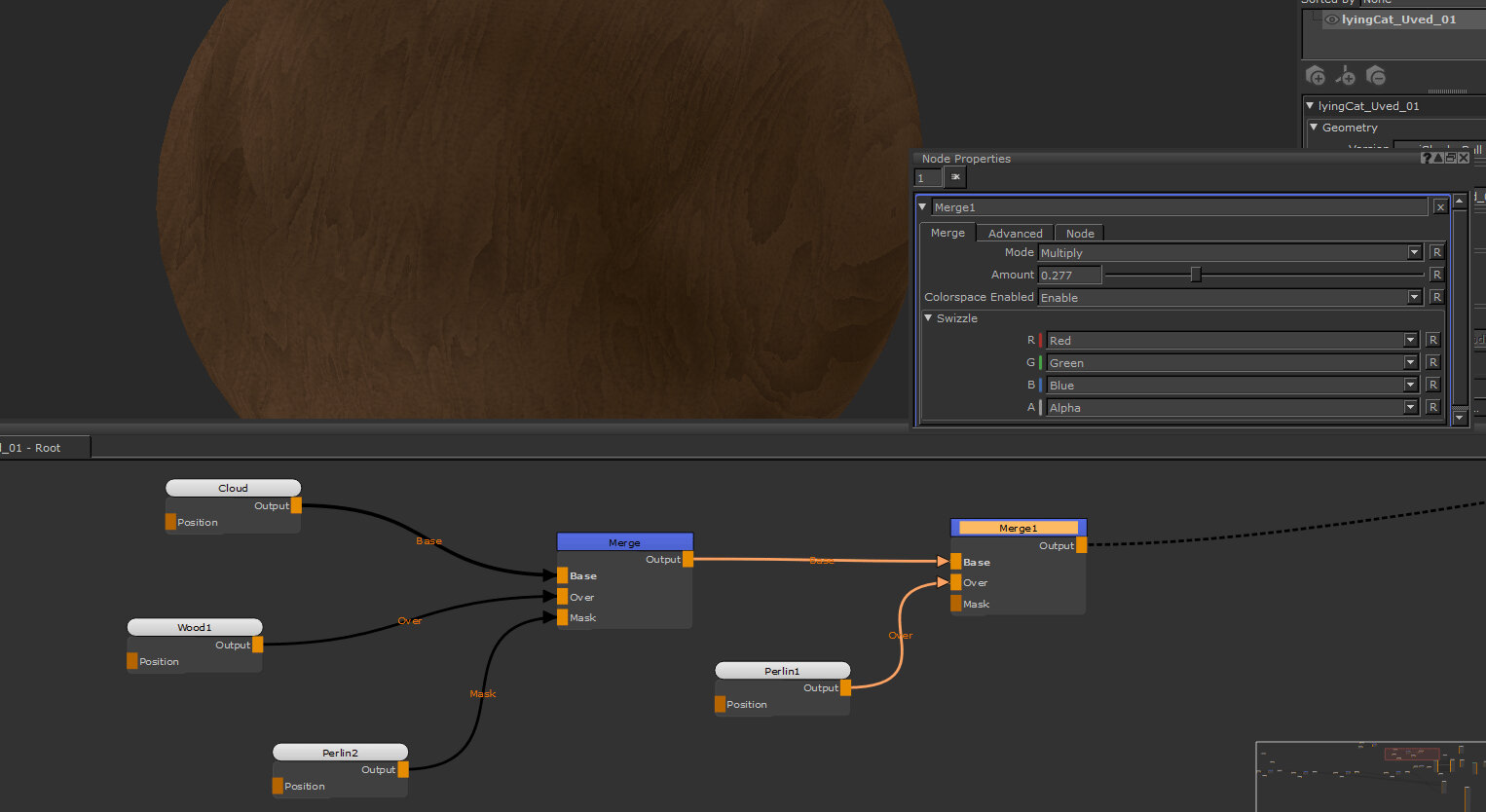 To add an extra level of realism, a Perlin node can be used as the mask. The result this has means the Wood node does not multiply evenly, in some places the effect is less obvious, breaking up the CG look which is always best avoided when texturing.