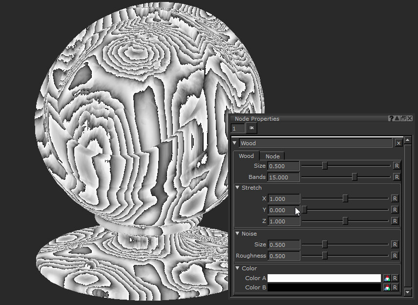 While creating a wooden effect is the most obvious use of this node, due to its striated nature it can be a great way to create other effects such as emulating layers of rock on a cliff texture or ripples in a sandy floor.
