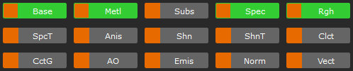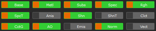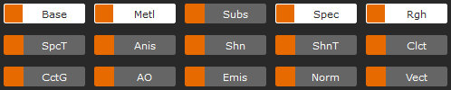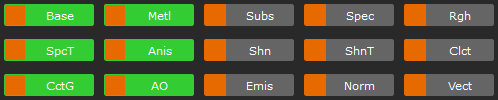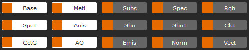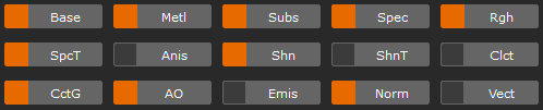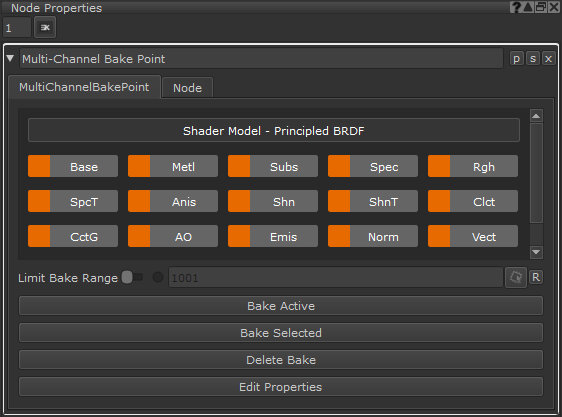 This section of the Multi-Channel Bake Point Node Properties allows you enable, disable, and select individual channels contained inside the Multi-Channel Bake Point node. From here you can choose which channels you want to create Bake Points for, by enabling those channels. If you only want to create Bake Points for a certain number of channels, you can select them in the Multi-Channel Properties, and use the Bake Selected button. All channels are enabled by default when a Multi-Channel Bake Point node is created. To disable a channel, click the orange button on the channel. Only enabled channels can be baked.