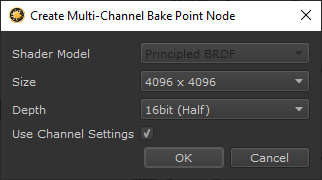 When you create a Multi-Channel Bake Point node, the Create Multi-Channel Bake Point Node dialog is displayed and you can choose the settings to apply to the node and the elements that are baked from it. After choosing the appropriate options, click Okay and the Multi-Channel Bake Point node is created.