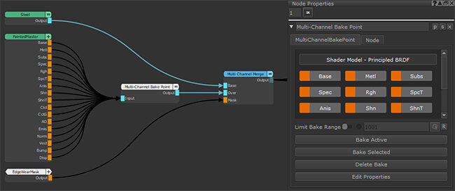 Multi-Channel Bake Point nodes create individual Bake Points for all channels belonging to your chosen shader model. These individual Bake Points are nested within the Multi-Channel Bake Point node so that only one node is required to bake an entire material. Each nested Bake Point can be added individually as an Export Item in the Export Manager. By default, the nested Bake Points are named in the following format: