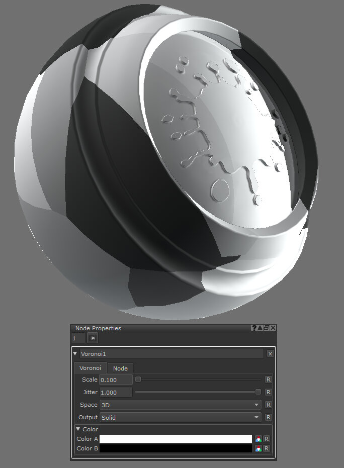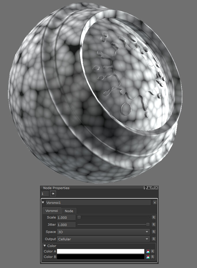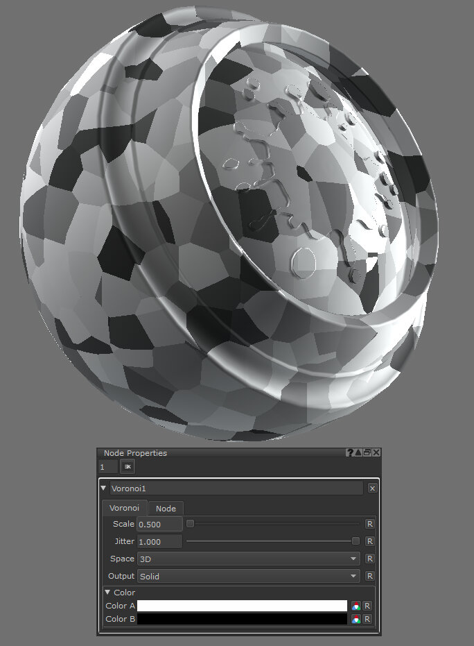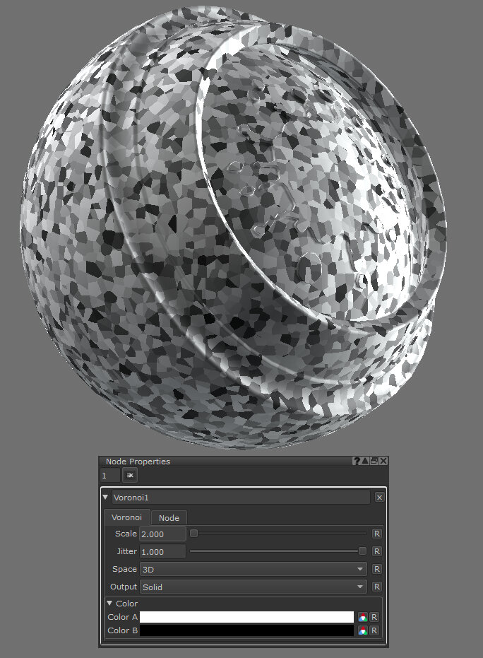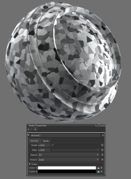 The Voronoi node creates a type of procedural noise. It is used to generate cells based on a Voronoi algorithm. Each point on the surface is owned by the nearest vertex of a jittered grid and generates a value from that vertex.