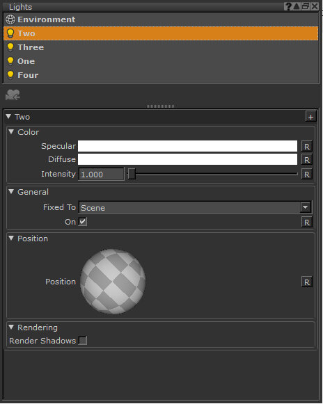 Tip: Mari has four basic point lights and an environment light. You cannot add or delete these lights. If you don't want a particular light, turn it off. As Mari saves the lights with the project, if you need the same lights in another project, you need to set them up separately.